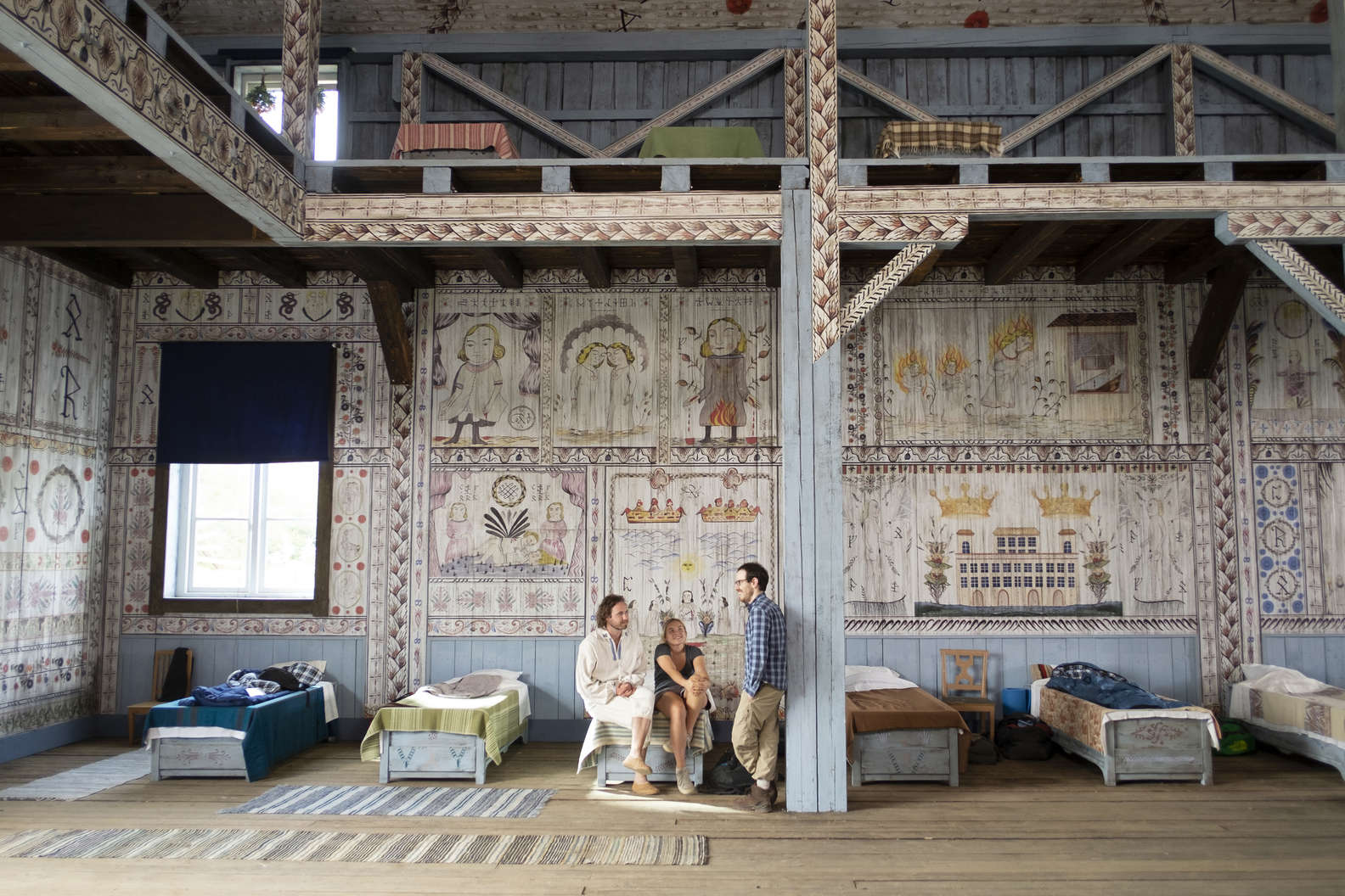LEFT: Attestupa ceremonial mallet, solid wood with 5 foot shaft. RIGHT: Attestupa tunic. TOP: Florence Pugh crowned as May Queen. COVER: Isabelle Grill and other cast members are seen wearing the hand embroidered costumes. All images Copyright A24.